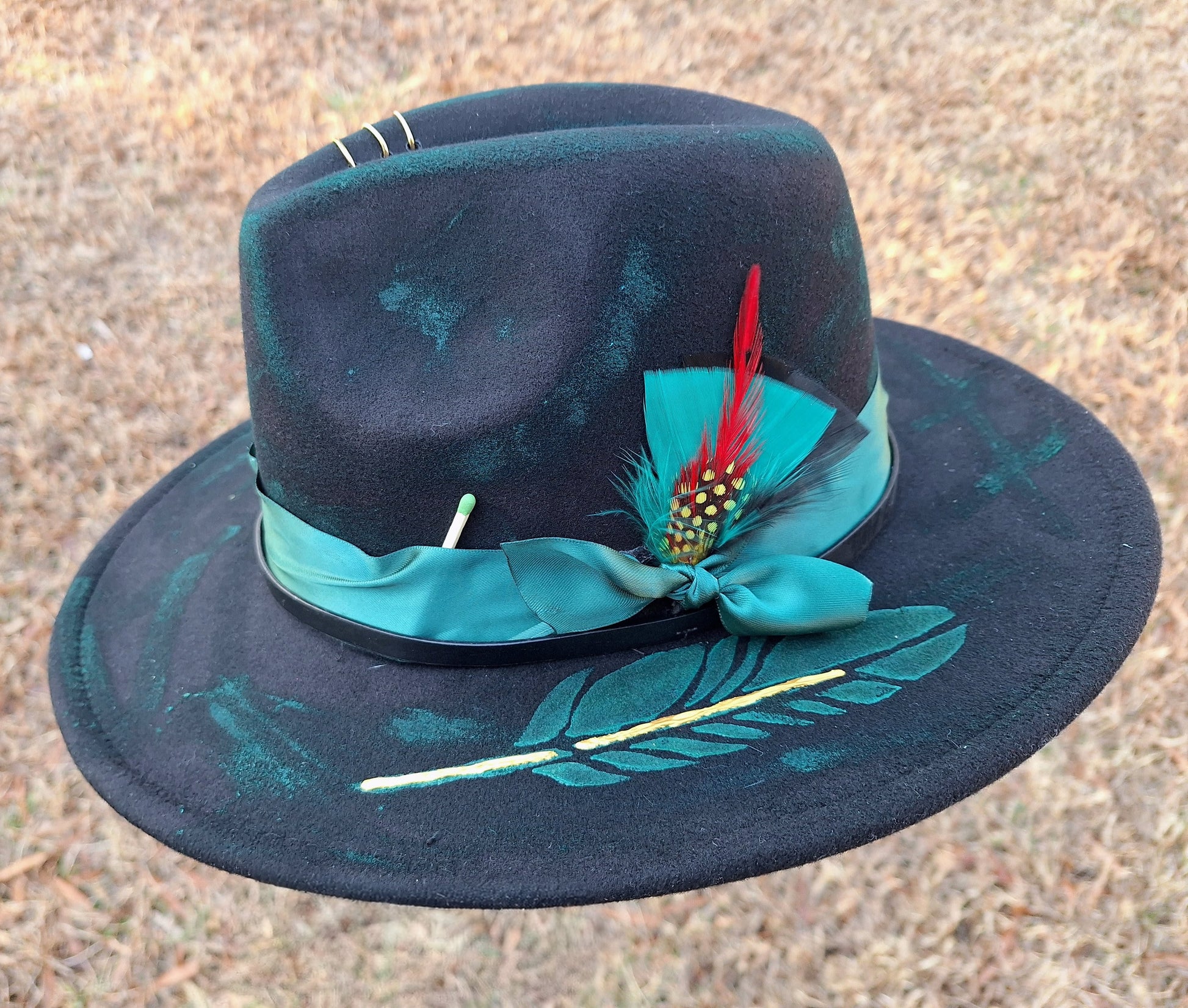 The "Deep Trail" Hat features a striking hand-painted design in warm colors, complemented by distinctive gold accents. Its classic versatility allows for various styling options, while the quality craftsmanship ensures durability. This hat is not only visually appealing but also serves as a stylish accessory for diverse occasions.